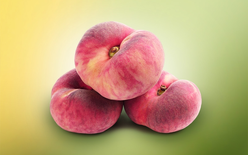- Despite their sweet taste, the flat peach contains very few calories, less than 40 per 100 grams.